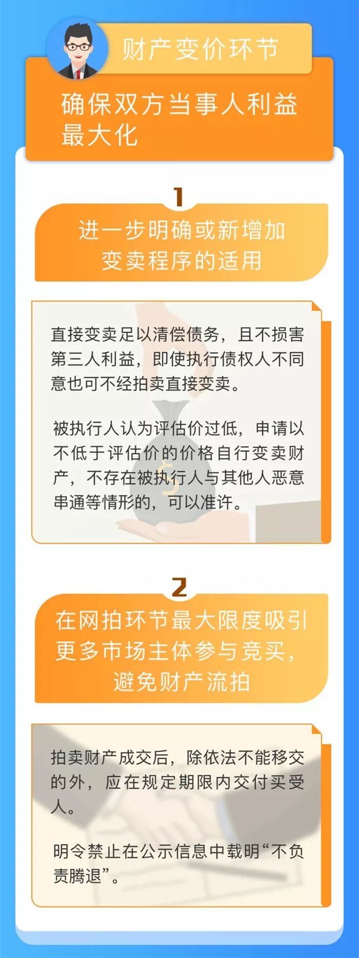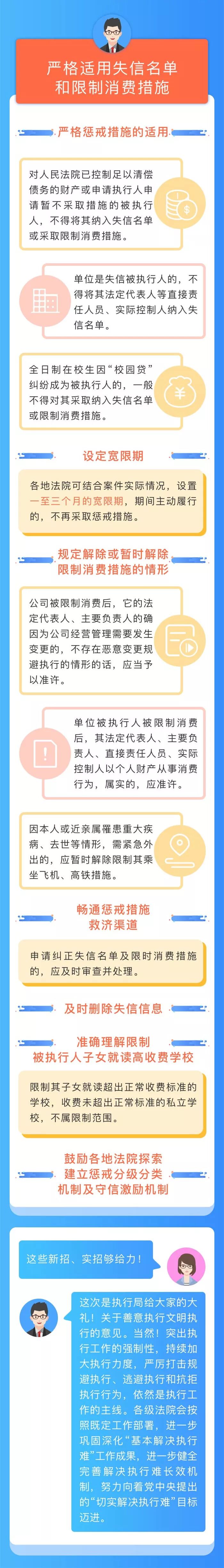 《意见》分为6大部分,共计22条,内容比较丰富,操作性也较强,时间关系,我重点介绍以下几个方面的内容: 一是严格禁止超标的查封和乱查封。针对实践中有的法院存在的超标的查封和乱查封问题,首先,在《意见》中明确,我们要采取有效措施坚决纠正实践中出现的超标的查封、乱查封现象,畅通人民群众反映问题渠道,对有关线索实行“一案双查”,对不规范行为依法严肃处理。其次,规定冻结被执行人银行账户内存款的,应当明确具体数额,不得影响冻结之外资金的流转和账户的使用;对于体量较大的不动产,如果其价值明显超出债权额,就应当对相应价值部分进行查封;如果不动产只有一个产权证书,无法进行分割查封,必要时,人民法院还要积极协调相关部门办理分割登记和分割查封。相关部门无正当理由拒不协助的,人民法院将依法对其采取处罚措施。最后,在《意见》第7条我们还规定,冻结上市公司股票的,应当以债权额为限计算出需要冻结的股票数量。在计算时,每股股票的价值以冻结前一交易日收盘价为基准,一般在不超过20%的幅度内确定,严格禁止超标的冻结上市公司股票。另外,对于股票已经被质押,并且本案申请执行人并非质权人的,针对实践中存在的冻结数量难以确定、存在超标的冻结风险等问题,我们经与相关部门沟通,也确立了质押股票新型冻结方式,主要目的是在保障债权人合法权益的同时,防范和解决质押股票超标的冻结问题。一直以来,对于超标的查封和冻结问题,最高人民法院的立场是坚定的,态度也是坚决的。在接下来一个阶段,我们将加大对该问题的监督和整治力度,也希望各级法院领导和同志们高度重视,严格落实。 二是在财产变价环节确保双方当事人利益最大化。首先,在现有司法解释基础上,进一步明确或新增加了变卖程序的适用。比如,在现有司法解释规定的基础上,《意见》第9条第2项增加了一种直接变卖的情形,即,如果直接变卖的变价款足以清偿执行债务,而且也不损害第三人利益的,即使执行债权人不同意,也可以不经拍卖直接变卖。再如,《意见》第9条第3项规定,被执行人认为法院的评估价过低,通过拍卖方式可能会损害他的利益,而申请以不低于评估价的价格自行变卖财产的,人民法院经过审查,认为不存在被执行人与其他人恶意串通,在财产评估环节故意压低评估价格,并以此价格低价变卖财产的,也可以准许。其次,在网拍环节最大限度吸引更多市场主体参与竞买,避免财产流拍。比如,《意见》第10条规定,人民法院在拍卖过程中,应当充分发挥网拍平台、拍卖辅助机构的专业优势,做好拍品视频宣介、实地看样等相关工作。再如,虽然根据现有司法解释规定(《拍卖变卖规定》第30条),拍卖财产成交后,除依法不能移交的外,人民法院应当在规定期限内交付买受人。但实践中,有个别法院在拍卖不动产时,认为腾退难度较大,就在公示信息中载明“不负责腾退”,致使竞买人不敢竞买,这不仅会导致财产因无人竞买而流拍,而且也严重损害了司法拍卖的公信力,对此,《意见》第10条予以明令禁止。 三是严格适用失信名单和限制消费措施。首先,在《意见》第14条重申人民法院必须严格按照相关司法解释规定的条件和程序采取这两项措施,在第16条明确不得采取惩戒措施的几类情形。其次,在《意见》第15条规定,各地法院可以结合案件实际情况,对于决定采取惩戒措施的被执行人,可以给予其一至三个月的宽限期,在宽限期内主动履行生效法律文书确定义务的,就不再采取惩戒措施;未履行的,再采取。通过这种威慑机制,一方面可以敦促被执行人履行义务,另一方面也可以最大限度降低对被执行人的不利影响。最后,在《意见》第17条规定了几类解除或暂时解除限制消费措施的情形。比如,公司被限制消费后,它的法定代表人、主要负责人的确因为公司经营管理需要发生变更的,原来的法定代表人、主要负责人申请解除对其本人的限制消费措施的,人民法院经审查,认为法定代表人、主要负责人不属于公司实际控制人或者影响债务履行的直接责任人员,也就是说,不存在恶意变更、规避执行的情形的话,应当予以准许。再如,对于实践中存在的,被限制消费的个人因为他本人,或者他的近亲属罹患重大疾病,或者他的近亲属去世等一些情形,需要紧急赶赴外地的,出于人道主义考虑,人民法院应当暂时解除限制其乘坐飞机、高铁措施。一是要进一步增强善意文明执行的主动性和责任感,充分认识善意文明执行对提升人民法院严格规范公正文明执行水平,对维护社会公平正义、促进社会和谐稳定,对完善产权保护制度、促进营商环境改善和推动高质量发展的重要意义,在执行过程中,应当严格按照本《意见》贯彻落实。二是要充分认识到,当前,被执行人规避执行、逃避执行仍是执行工作的主要矛盾和突出问题。突出执行工作的强制性,持续加大执行力度,严厉打击规避执行、逃避执行和抗拒执行行为,依然是执行工作的主线。各级法院要按照既定工作部署,驰而不息、久久为功,进一步巩固深化“基本解决执行难”工作成果,进一步健全解决执行难长效机制,努力向着党中央提出的“切实解决执行难”目标迈进。三是各级法院领导干部和执行干警要准确把握善意文明执行的精神实质。善意文明执行是在依法执行的基础上,对执行工作提出的更加