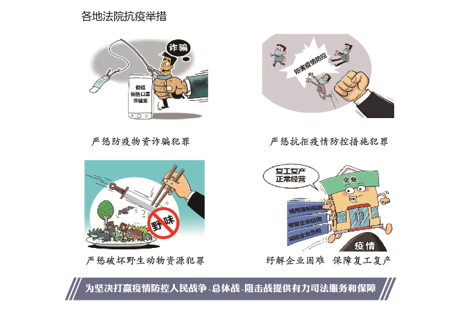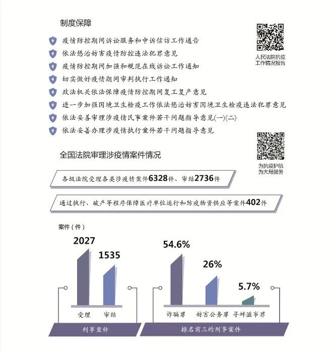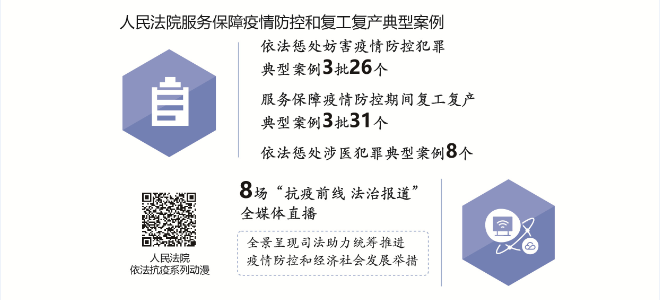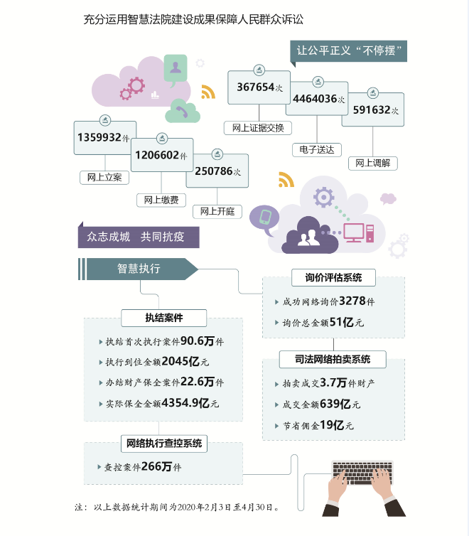 面对突如其来的疫情,最高人民法院坚决贯彻习近平总书记重要指示精神和党中央决策部署,在中央政法委领导下,认真落实依法防控要求,单独或会同有关单位制定依法惩治妨害疫情防控犯罪、惩治妨害国境卫生检疫犯罪、保障复工复产等意见,完善服务“六稳”“六保”司法举措,发布57个惩处涉疫犯罪和服务复工复产典型案例,努力为抗疫护航、为大局服务。各级法院统筹做好疫情防控和维护稳定等工作,审结各类涉疫案件2736件,促进涉疫矛盾纠纷源头预防化解;严惩侵害医务工作者人身安全和人格尊严犯罪,保护抗疫中负重前行的“最美逆行者”;坚持审慎善意文明司法,积极为中小微企业纾困解难;运用远程立案、网上审判、智慧执行及时定分止争。智慧法院在疫情防控期间“大显身手”,全国法院网上立案136万件、开庭25万次、调解59万次,电子送达446万次,网络查控266万件,司法网拍成交额639亿元,执行到位金额2045亿元。广大法院干警特别是湖北和武汉法院干警坚决响应党中央号召,积极投身各地抗疫一线,为统筹推进疫情防控和经济社会发展工作提供了司法服务和保障,体现了忠于党、忠于国家、忠于人民、忠于法律的政治本色。