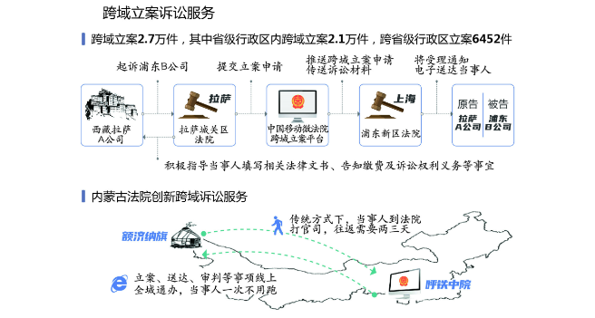 推广跨域立案诉讼服务。在全国范围全面推开跨域立案诉讼服务,当事人可以就近选择法院提交立案申请,减少往来奔波。京津冀、长三角地区率先实现跨域立案域内全贯通,全国中级、基层法院和海事法院实现跨域立案服务全覆盖,“家门口起诉”新模式有效解决群众异地诉讼不便问题。