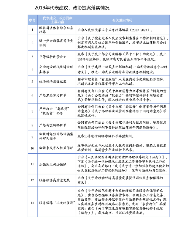 依法接受人大监督,认真落实十三届全国人大二次会议决议和代表提出的意见建议,逐项细化分工,加强跟踪督办。认真落实全国人大常委会关于解决执行难情况专项报告的审议意见,并专门报告落实情况。向全国人大常委会专题报告刑事审判工作情况,根据审议意见,推进新时代刑事审判工作发展。认真办理代表建议355件,办理日常建议395件,全程密切沟通,充分采纳代表意见。邀请全国人大代表视察法院、参加会议、旁听庭审等活动1492人次,专门邀请代表共同开展长江、黄河流域生态环境司法保护调研。认真接受民主监督,办理政协提案173件,走访接待全国政协委员180人次;加强与民主党派、工商联和无党派人士沟通,广泛听取意见。深入贯彻监察法,支持配合监察机关对法院工作人员进行监督。依法接受检察机关诉讼监督,公正审理抗诉案件,认真办理检察建议。广泛接受社会监督,积极开展特约监督员、特邀咨询员、专家学者调研座谈、列席审委会等活动。加强与新闻媒体互动,深入开展全媒体直播活动,主动接受舆论监督。