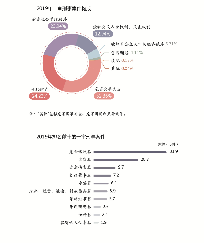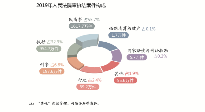1.审结、执结2902.2万件:指地方各级人民法院2019年审结、执结各类案件总数。其中,审结刑事案件1975511件,占6.81%;民商事案件16177373件,占55.74%;行政案件692034件,占2.38%;国家赔偿与司法救助案件57377件,占0.20%;执结执行案件9546952件,占32.90%;强制清算与破产案件17399件,占0.06%;其他案件555710件,占1.91%。报告中的案件数据,未经特别说明的,均为一审结案数据。报告中反映的各项工作,包括最高人民法院和地方各级人民法院工作。