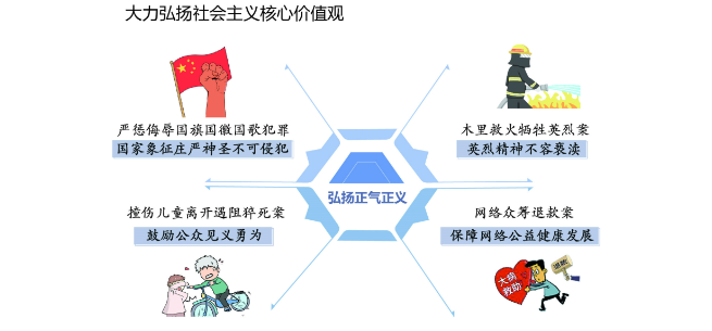 弘扬社会主义核心价值观。高扬爱国主义旗帜,严惩侮辱国旗国徽国歌犯罪,宣示国家象征庄严神圣不可侵犯。审结英烈保护公益诉讼案件22件,对侵害方志敏、董存瑞、黄继光、木里救火牺牲勇士等英烈权益的行为,严肃追究法律责任,旗帜鲜明捍卫英烈荣光。贯彻《新时代公民道德建设实施纲要》,坚持把社会主义核心价值观融入司法工作,用法治力量引导人们向上向善。会同国家发展改革委等健全失信被执行人联合惩戒机制,鼓励诚实守信,惩戒失信违约。审理网络众筹退款等案件,规范网络公益行为,守护扶危济困、诚信友善的传统美德。
