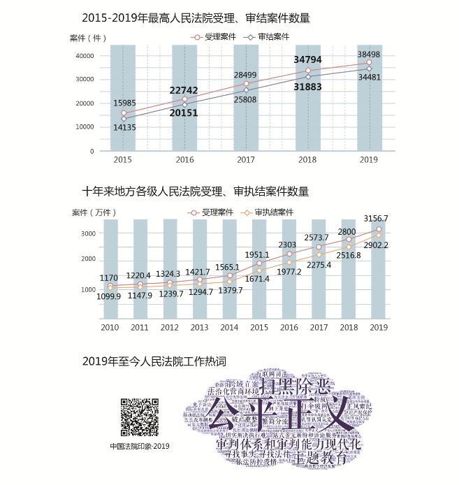 2019年,最高人民法院坚持以习近平新时代中国特色社会主义思想为指导,在以习近平同志为核心的党中央坚强领导下,在全国人大及其常委会有力监督下,增强“四个意识”、坚定“四个自信”、做到“两个维护”,全面贯彻党的十九大和十九届二中、三中、四中全会精神,深入贯彻习近平总书记主持中央政治局常委会会议听取最高人民法院党组工作汇报时的重要讲话精神,认真落实十三届全国人大二次会议决议,紧紧围绕“努力让人民群众在每一个司法案件中感受到公平正义”目标,坚持服务大局、司法为民、公正司法,忠实履行宪法法律赋予的职责,推动各项工作取得新成效,为经济社会发展提供有力司法服务和保障。最高人民法院受理案件38498件,审结34481件,同比分别上升10.7%和8.2%,制定司法解释20件,发布指导性案例33个,加强对全国法院审判工作的监督指导;地方各级法院受理案件3156.7万件,审结、执结2902.2万件,结案标的额6.6万亿元,同比分别上升12.7%、15.3%和20.3%。