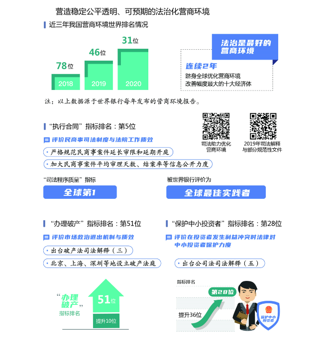 营造法治化营商环境。法治是最好的营商环境。各级法院审结一审商事案件453.7万件。制定服务高质量发展意见,出台公司法、破产法司法解释,发布民商事审判工作会议纪要,统一法律适用和裁判尺度,增强司法透明度和可预期性。依法审理涉“放管服”改革行政诉讼案件,支持监督行政机关依法行政,审结一审行政案件28.4万件,助推法治政府建设,优化发展软环境。世界银行2020年营商环境报告显示,我国营商环境世界排名大幅跃升,“执行合同”“办理破产”“保护中小投资者”等与司法密切相关的指标明显提高,其中“司法程序质量”领先,被评价为这一领域的“全球最佳实践者”。