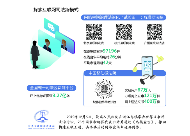 探索互联网司法新模式。发挥北京、杭州、广州互联网法院“试验田”作用,推广“网上案件网上审理”,完善在线诉讼规则,让群众享受在线诉讼便利。全面推广“中国移动微法院”,推动电子诉讼服务向移动端发展,引领世界移动电子诉讼发展潮流。审理“直播带货”“暗刷流量”等新型互联网案件,明确网络空间行为规范、权利边界和责任,促进网络空间治理法治化。在乌镇举办世界互联网法治论坛,深化互联网司法国际合作,推动构建网络空间命运共同体。