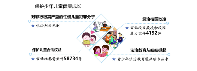 保护未成年人健康成长。完善少年司法制度,坚持圆桌式审判。广州中院陈海仪法官用母亲般的关怀帮助失足少年走向新生。通过组织观摩少年法庭,让少年体验司法,学习法律常识。依法严惩侵害少年儿童身心健康的犯罪,对性侵儿童的赵志勇、何龙等罪行极其严重的一批犯罪分子,坚决依法判处死刑。会同民政部等出台意见,加强对无人抚养儿童的保护,贵州等法院专门制定保护农村留守儿童合法权益文件,让每一个孩子都沐浴在法治的阳光下。加强校园欺凌预防处置,审结相关案件4192件。会同教育部等完善校园安全事故处理机制,依法惩治涉及“校闹”的犯罪。积极推进司法保护与行政、家庭、学校、社区保护联动机制试点,用法治呵护少年儿童健康成长。