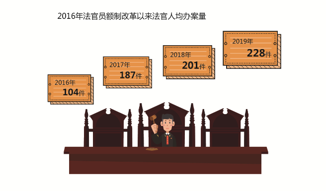 司法改革和智慧法院作为人民法院审判体系和审判能力现代化的“车之两轮、鸟之双翼”,有力提升了审判质效。2019年,全国法院法官人均办案228件,同比增长13.4%;各类案件一审后当事人服判息诉率89.2%,二审后达到98.2%;涉诉信访总量、涉诉进京访同比分别下降13.3%和40%;互联网法院案件平均审理周期42天,比传统模式缩短57.1%。