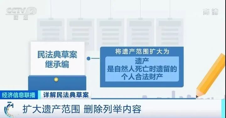 此次民法典草案继承编对继承遗产的范围做了改变,将《继承法》中遗产范围,公民的收入、房屋、林木、文物、著作权等一一列举的内容删除,将遗产范围扩大为“遗产是自然人死亡时遗留的个人合法财产”。立法上采取了概括的方式,只要是自然人合法取得的财产,都属于遗产,可以被继承,像现在部分人拥有一些网络游戏的财产、虚拟货币等都概括其中。最大限度地保障私有财产继承的需要。