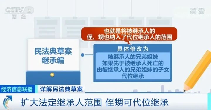 民法典草案第907条还增加了代位继承的范围:“被继承人的兄弟姐妹如果先于被继承人死亡的,由被继承人的兄弟姐妹的子女代位继承。”也就是被继承人的侄子、外甥也获得了继承权.
